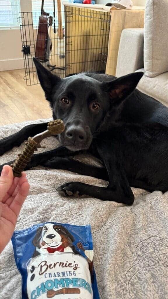 First off, I absolutely love all of Bernies Best products because of the high-quality, no filler or junk, ingredients. I've been feeding my Bernese Mountain Dog, Odin, Charming Chompers for over a year now and have seen a big difference in the lack of tartar and plaque buildup on his teeth, especially molars and canines. We have a routine that he gets his daily Chompers when he comes home from work (he goes to work with me). He goes directly to the pantry and stares at the bag and won't move until he gets his dental chew. When I give it to him his mouth quivers with excitement!