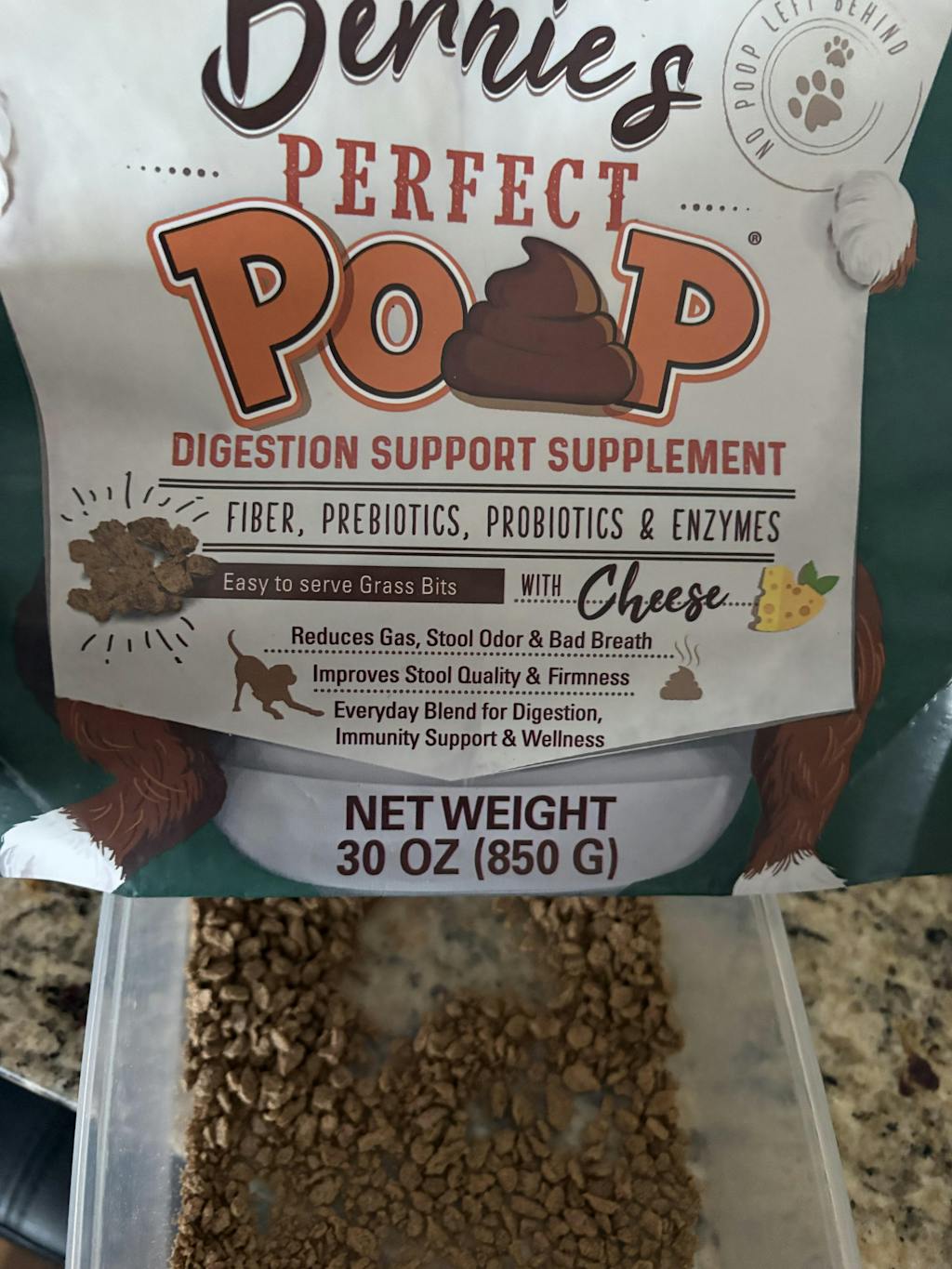 We would be a mess without Bernie's Perfect Poop. Picture Perfect Poop every time. This is my second rescue that has had success using this product. My recent pup just needs a small amount sprinkled on her food.The Customer Service is Amazing if you have any questions about the product. It's absolutely worth a try. It can change your pups life.