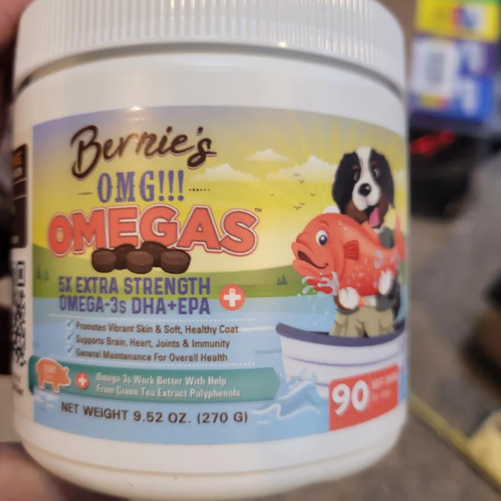 Bernie's OMG! Omegas are formulated for dogs of all ages. DHA supports cognitive development in puppies and younger dogs. EPA is a powerful antioxidant and anti-inflammatory that benefits adult and senior dogs by supporting joint health, cardiovascular function, healthy coat maintenance, and cognitive function.