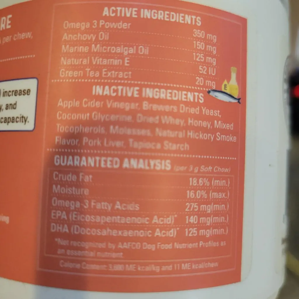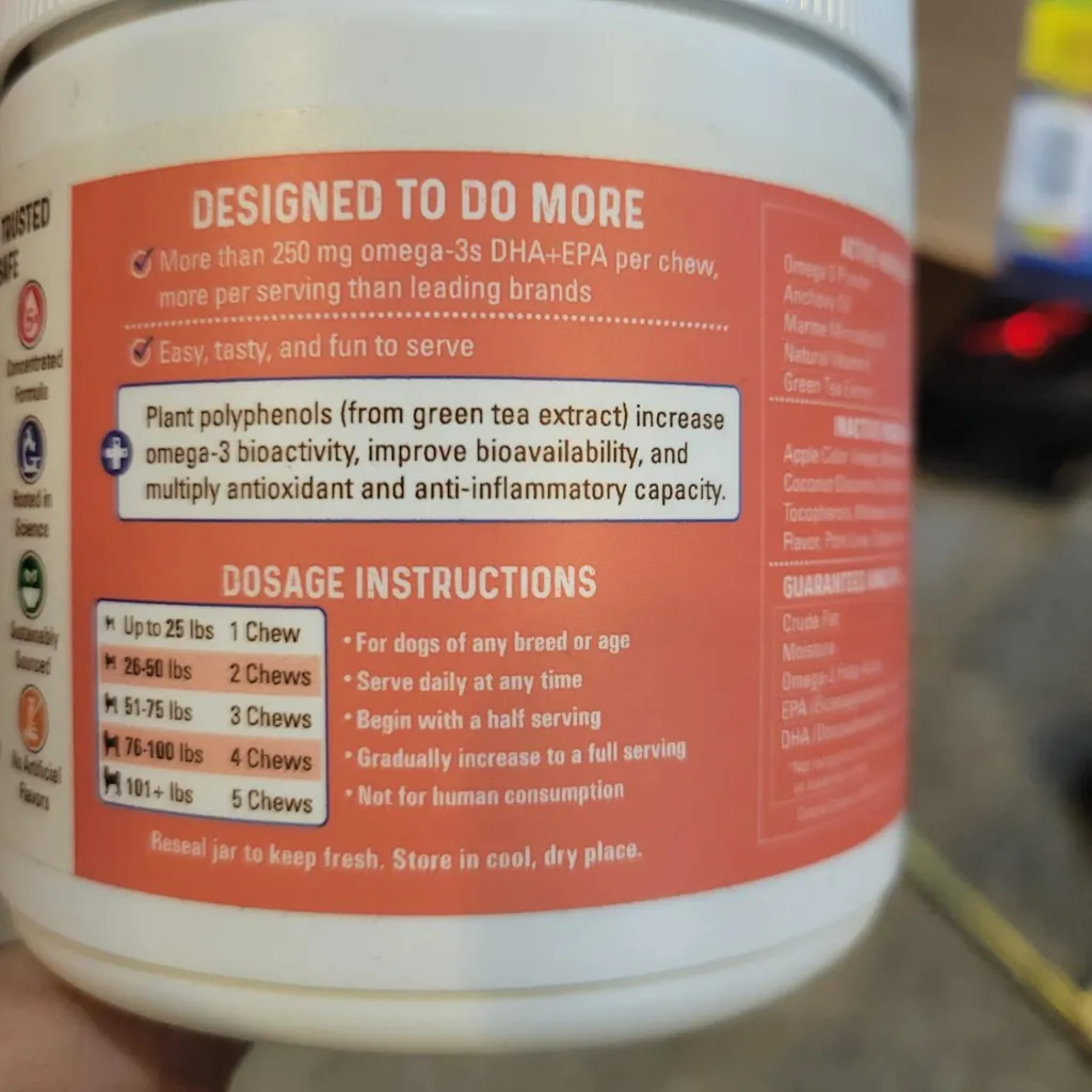 This is a great fish oil chew. My senior dog inhales the pork flavor. His bloodwork showed improvements in about three weeks. He has food allergies so gut health is importantly. His fur was shinier and less itching. No diarrhea resulted from this