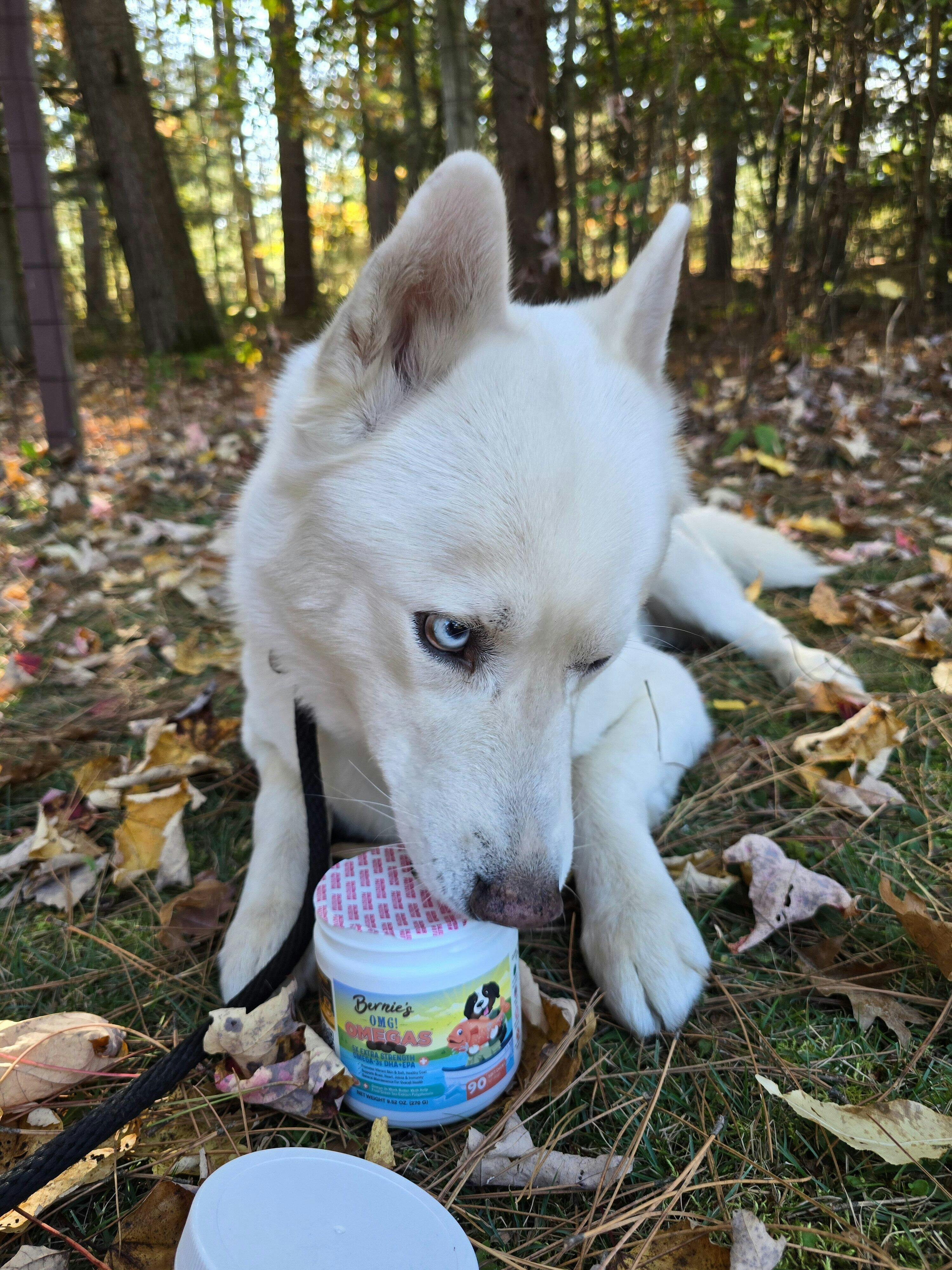 Bernie's OMG! Omegas are formulated for dogs of all ages. DHA supports cognitive development in puppies and younger dogs. EPA is a powerful antioxidant and anti-inflammatory that benefits adult and senior dogs by supporting joint health, cardiovascular function, healthy coat maintenance, and cognitive function.
